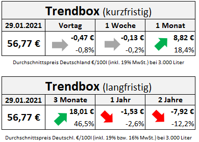 Dieser Preissprung wird auch an der Grafik zur Heizölpreisentwicklung deutlich, die gleichzeitig aber zeigt, dass sich die Preise seit Jahresanfang nur wenig verändert haben. Im Vergleich zum letzten Jahr liegen die aktuellen Januarpreise durchschnittlich 14% unter denen von 2020. Allerdings nähern sich die Kurven seit einigen Tagen an und am heutigen 29. Januar beträgt der Unterschied zum Vorjahr nur noch 2,6% oder 1,53 Euro.