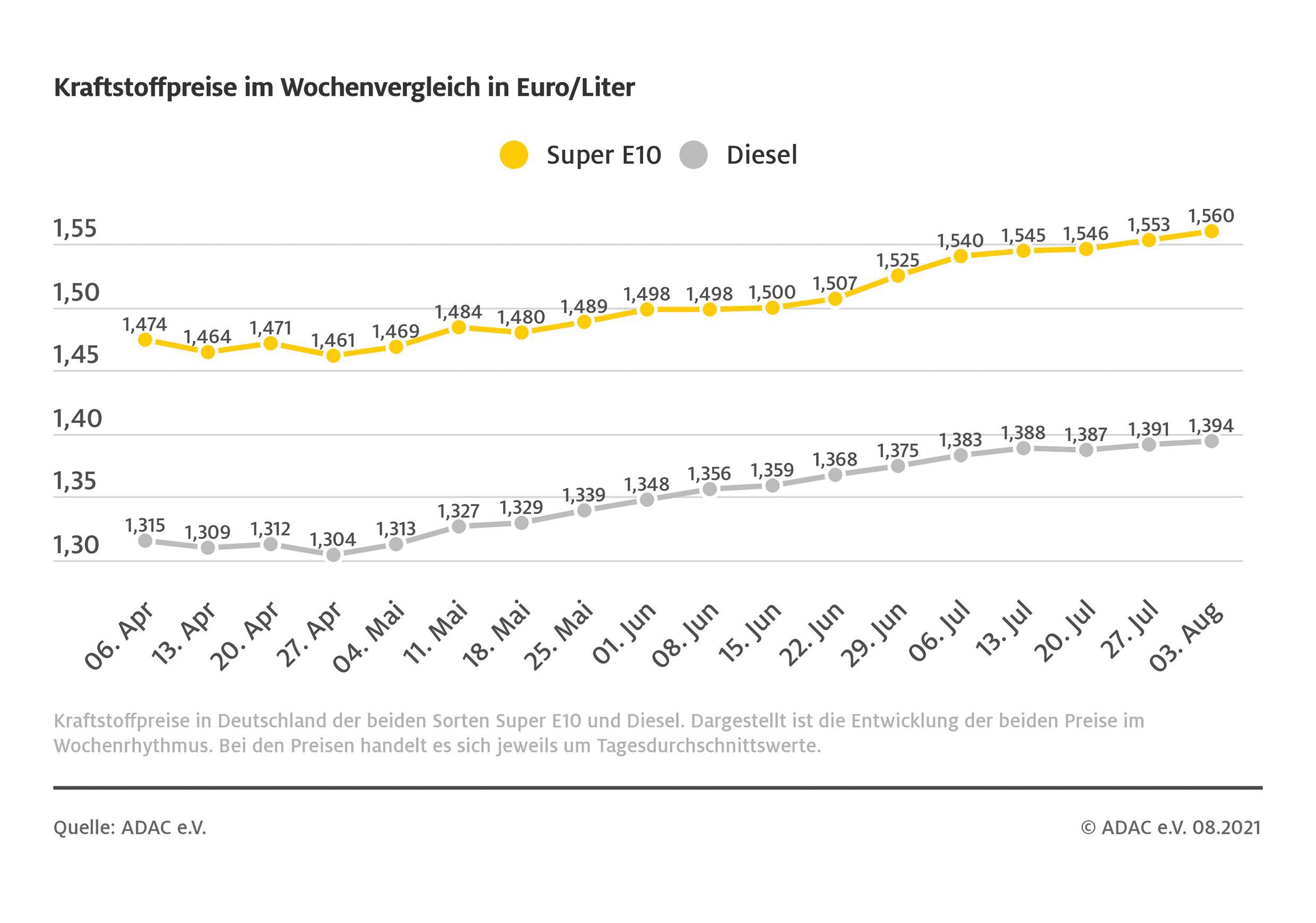 München (ots) – Ungeachtet des leichten Rückgangs der Rohölnotierungen müssen die Autofahrer in Deutschland beim Tanken erneut mehr bezahlen als vor einer Woche. Wie der ADAC meldet, kostet ein Liter Super E10 derzeit im bundesweiten Mittel 1,560 Euro, das sind 0,7 Cent mehr als vor Wochenfrist. Der Preis für Diesel-Kraftstoff stieg um 0,3 Cent auf 1,394 Euro. Gleichzeitig ist der Preis für Rohöl der Nordseesorte Brent seit vergangener Woche um etwa einen US-Dollar gefallen.