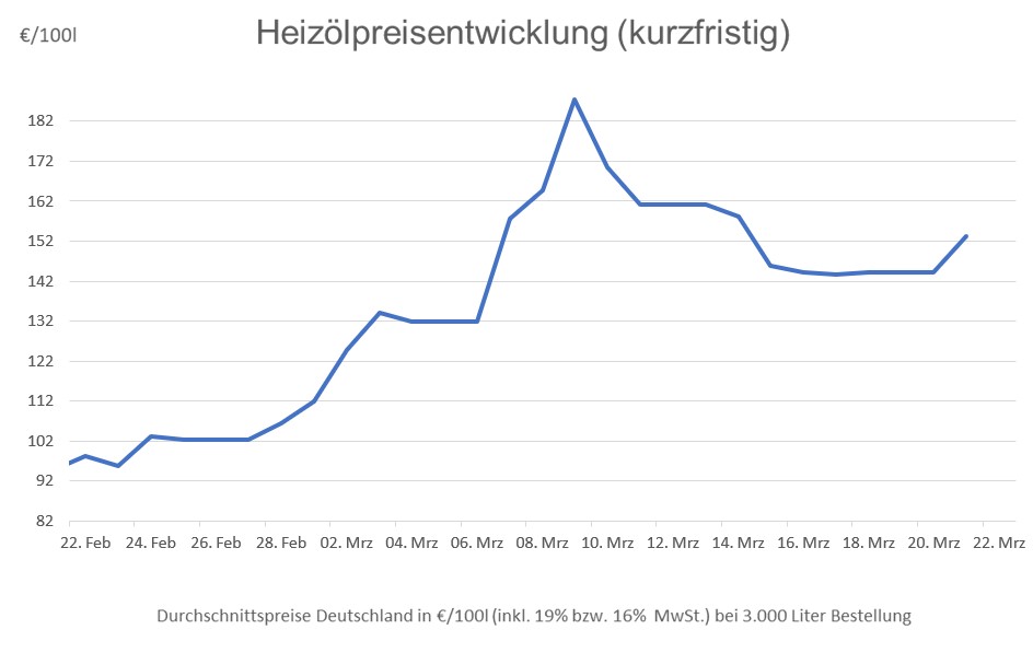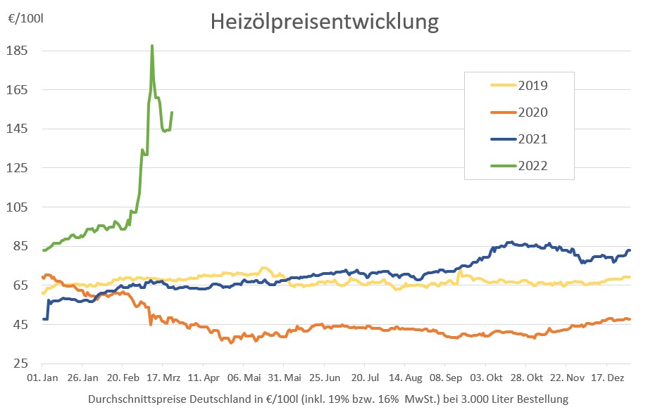 Vom bisherigen Spitzenwert am 9. März, der bei durchschnittlich 187,42 Euro pro 100 Liter und damit so hoch wie nie zuvor lag, sind die Heizölpreise im Bundesgebiet damit zwar noch um einiges entfernt. Doch im Mehrjahresvergleich wird deutlich, wie massiv die Preise in den letzten Wochen explodiert sind.