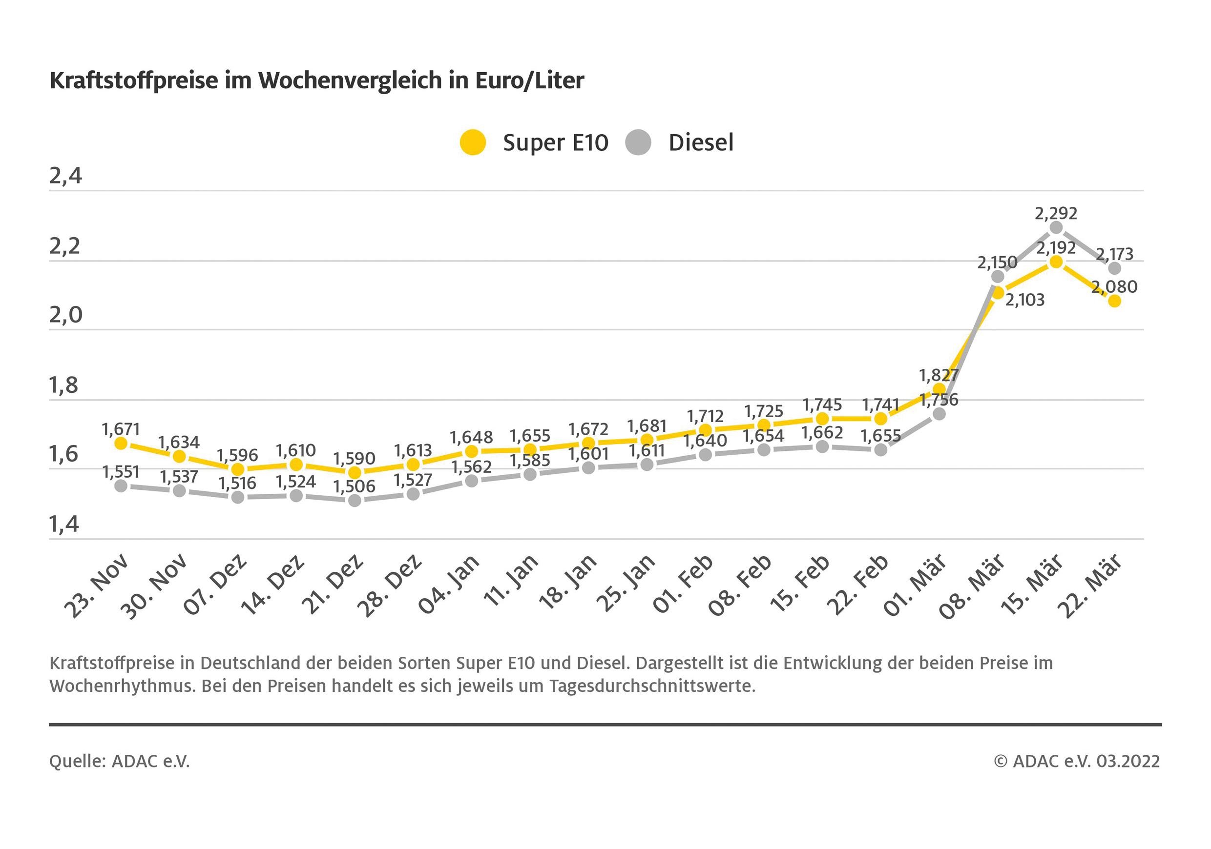 München (ots) – Tanken ist gegenüber der Vorwoche ein gutes Stück preiswerter geworden. Wie die aktuelle ADAC Auswertung der Kraftstoffpreise zeigt, ist der Preis für einen Liter Super E10 seit vergangener Woche um 11,2 Cent gesunken. Danach kostet ein Liter derzeit im bundesweiten Mittel 2,080 Euro. Ähnlich deutlich ist auch der Preis für Diesel gefallen: Für einen Liter müssen die Autofahrer aktuell im Schnitt 2,173 Euro bezahlen, das ist ein Minus von 11,9 Cent. Seit vergangenen Freitag ist die aus Verbrauchersicht erfreuliche Entwicklung jedoch zum Stillstand gekommen.