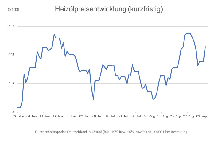Allerdings erwies sich dieser Preisnachlass als recht kurzlebig, denn mit Septemberbeginn orientierten sich die durchschnittlichen Heizölpreise schon wieder nach oben und so müssen sich die Verbraucherinnen und Verbraucher auch heute wieder an Preisaufschläge von über fünf Euro pro 100 Liter im Vergleich zu Freitag anfreunden. Im Monatsvergleich ist Heizöl heute sogar fast 16 Euro teurer als Anfang August.