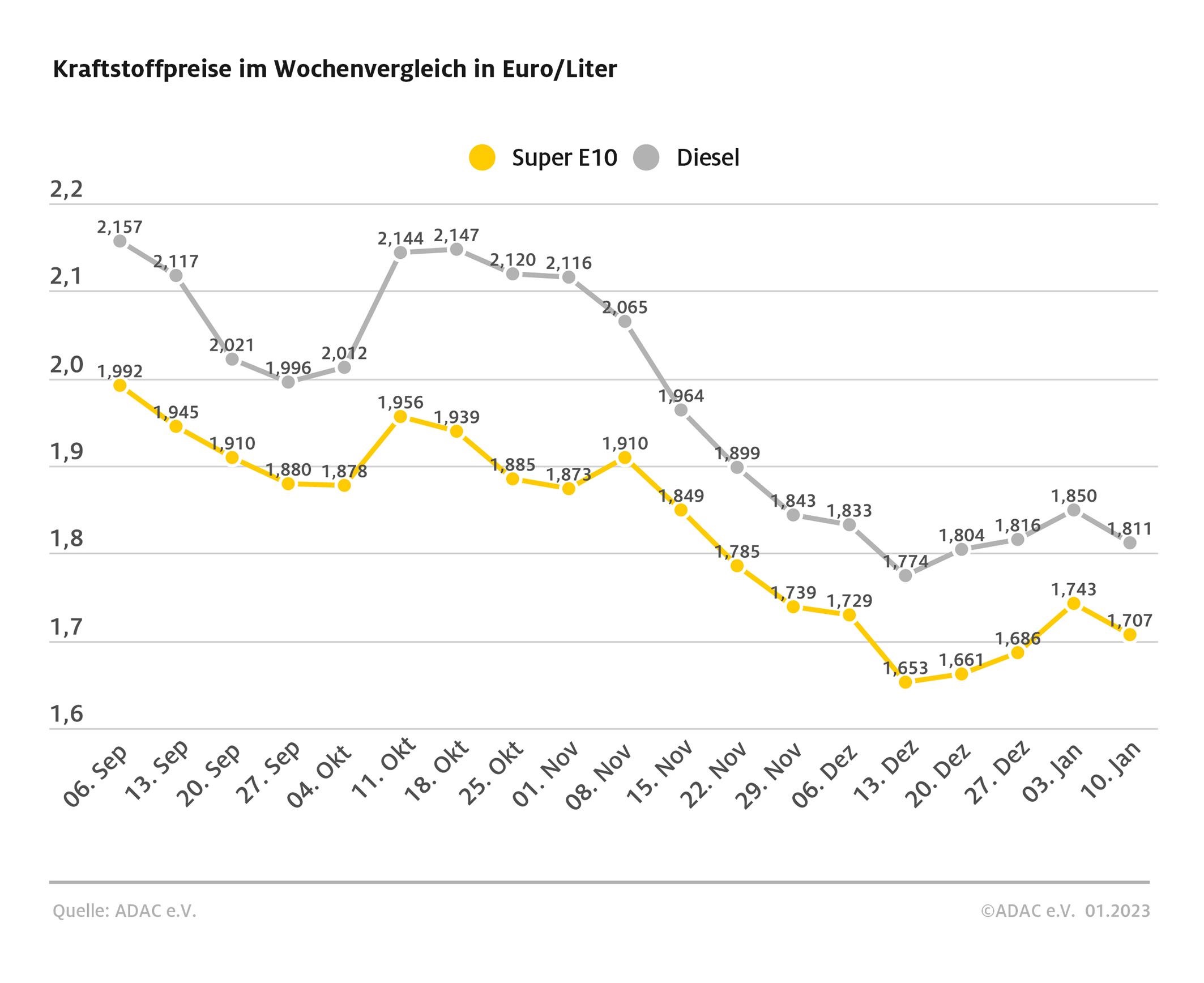 München (ots) – Leichte Entspannung an den Zapfsäulen: Nachdem die Spritpreise seit Mitte Dezember zuletzt um bis zu neun Cent je Liter gestiegen waren, zeigt sich nun ein spürbarer Rückgang. Laut aktueller ADAC Auswertung der Kraftstoffpreise in Deutschland kostet ein Liter Super E10 im bundesweiten Mittel 1,707 Euro – ein Minus von 3,6 Cent gegenüber der Vorwoche. Noch deutlicher ist der Preisrückgang bei Diesel: Ein Liter kostet 1,811 Euro, das sind 3,9 Cent weniger als vor Wochenfrist.