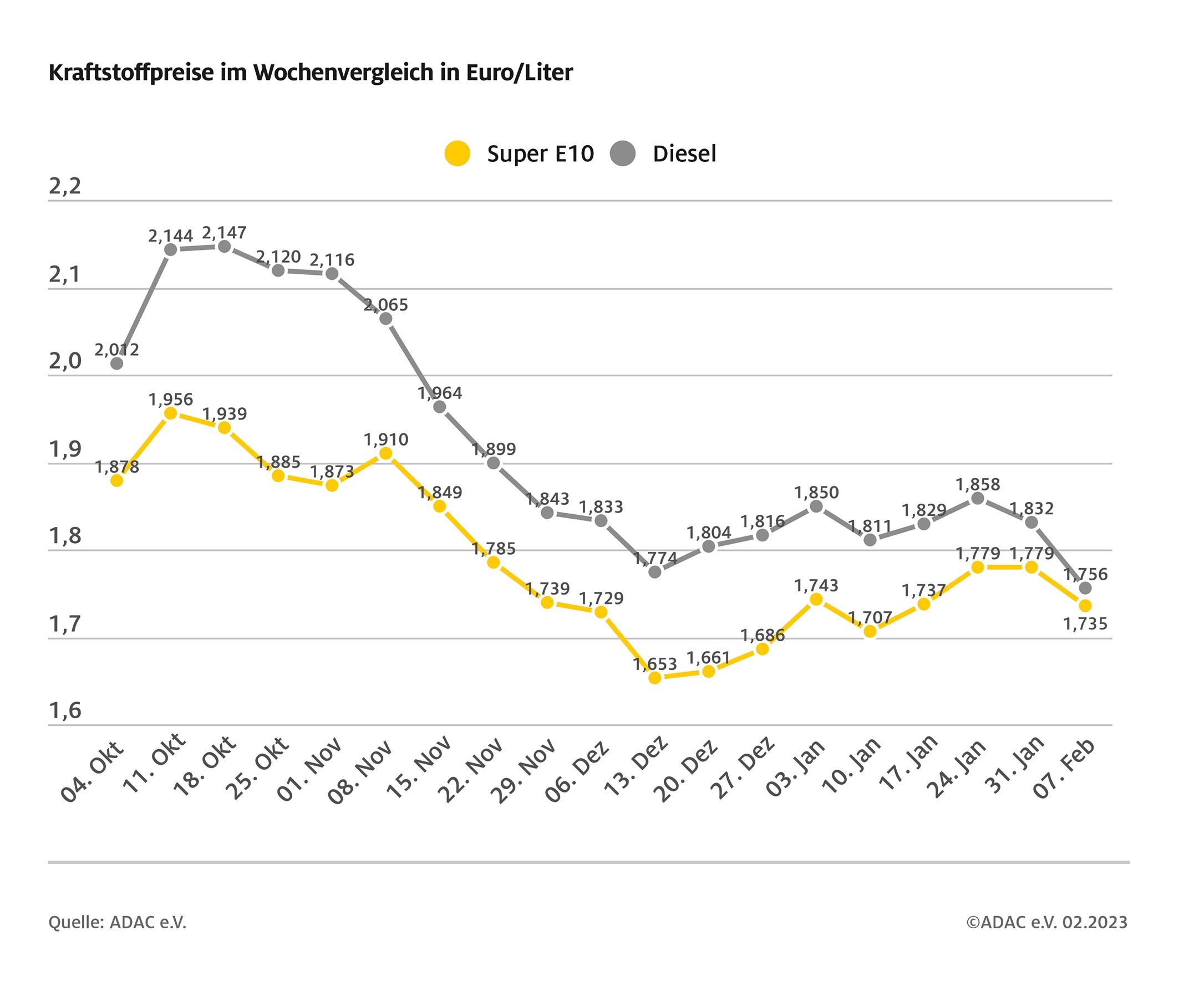 München (ots) – Deutliche Entspannung am Kraftstoffmarkt, vor allem aber für die Fahrer von Diesel-Pkw: Wie die heutige aktuelle ADAC-Auswertung der Kraftstoffpreise zeigt, kostet ein Liter Diesel im bundesweiten Mittel 1,756 Euro, das sind 7,6 Cent weniger als in der Vorwoche. Auch Benzin hat sich verbilligt. Ein Liter Super E10 kostet aktuell im Schnitt 1,735 Euro – ein Minus von 4,4 Cent.