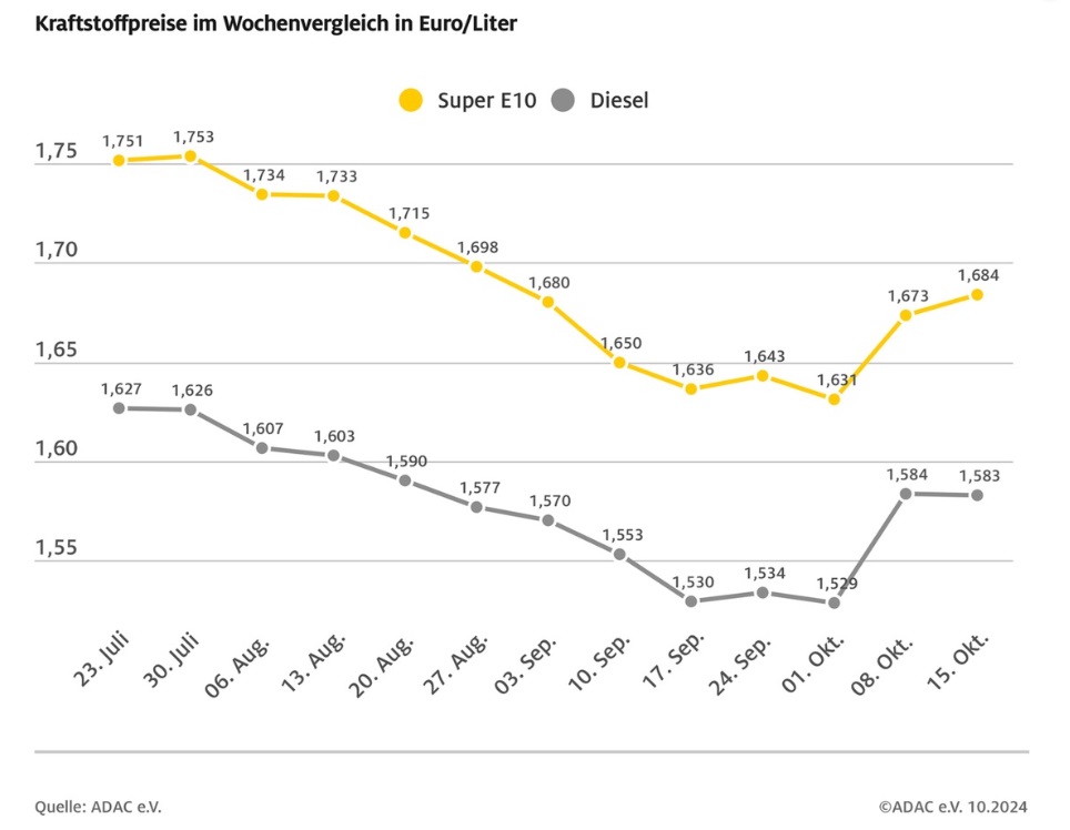 Danach kostet ein Liter Super E10 im bundesweiten Mittel 1,684 Euro der Preis für einen Liter Diesel stagniert nahezu bei nun 1,583 Euro.