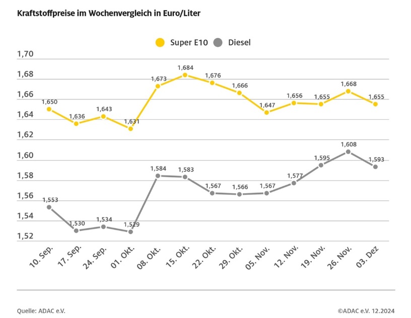 Der ADAC weist darauf hin, dass am 1. Januar 2025 die nächste Stufe der CO2-Abgabe in Kraft tritt. Damit steigt der Preis von 45 Euro auf 55 Euro pro Tonne. Für die Kraftstoffpreise bedeutet dies umgerechnet, dass sich sowohl für Benzin als auch für Diesel zum Jahreswechsel der Anteil der CO2-Abgabe um etwa drei Cent je Liter erhöht.