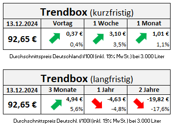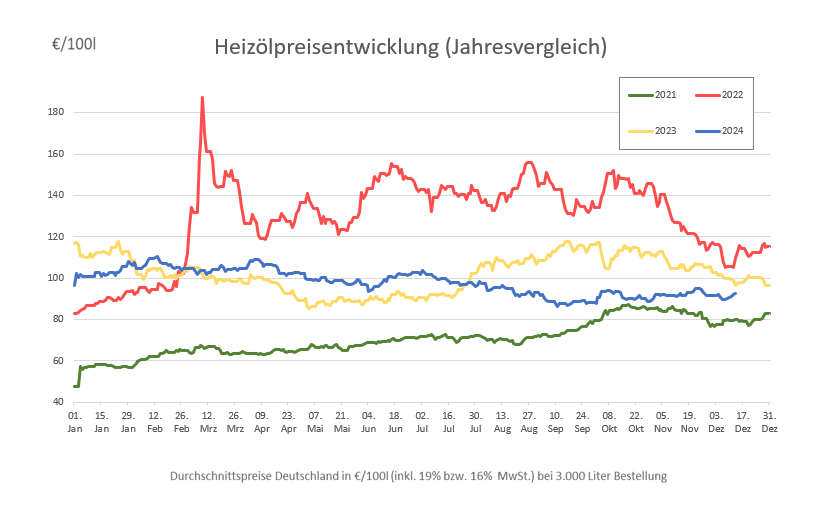 Die Preiskurve der letzten Monate zeigt allerdings auch, dass die Heizölpreise im Durchschnitt immer noch untern den Hochs von Anfang Oktober (94,06 Euro) und Ende November (94,82 Euro) liegen. Am 23. November hatten die Heizölpreise im Bundesgebiet den höchsten Stand seit dem Sommer erreicht. Von diesen Niveaus sind wir aktuell immer noch über zwei Euro entfernt.