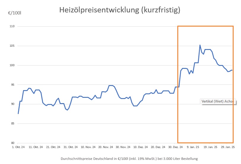 Zu Jahresbeginn 2025 war es mit der sich zuvor monatelang hinziehenden Seitwärtsbewegung bei den Heizölpreisen erst einmal vorbei. Zu diesem Zeitpunkt trug die weitere Anhebung der CO2-Abgabe, die seit 2021 vom Staat auf fossile Brennträger erhoben wird, ihren Anteil zu den deutlich anziehenden Heizölpreisen bei.