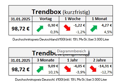 Von den Höchstständen die im Februar des vergangenen Jahres bei etwa 110 Euro markiert wurden, bleiben die bundesweiten Durchschnittspreise damit nach wie vor ein ganzes Stück weit entfernt.