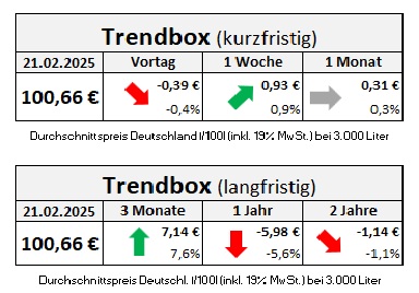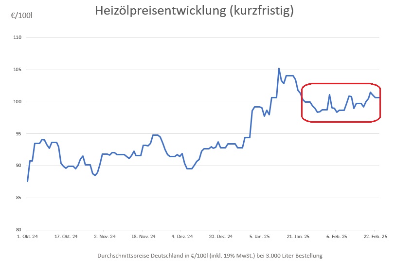 Die genannten Heizölpreise beziehen sich stets auf den deutschlandweiten Durchschnittspreis bei einer Bestellung von 3.000 Liter Heizöl Standard schwefelarm inklusive 19 % MwSt. Außerdem fallen durch Transportkosten die Preise regional unterschiedlich aus. Stand der Preise 21.02.2025