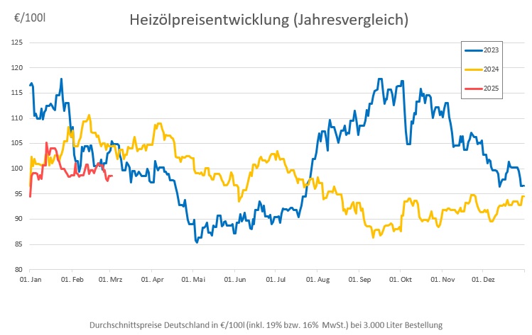 Die genannten Heizölpreise beziehen sich stets auf den deutschlandweiten Durchschnittspreis bei einer Bestellung von 3.000 Liter Heizöl Standard schwefelarm inklusive 19 % MwSt. Außerdem fallen durch Transportkosten die Preise regional unterschiedlich aus. Stand der Preise 28.02.2025
