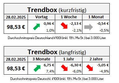 Die höchste Notierung war dabei bereits am 3. Februar zu beobachten gewesen, als für 100 Liter im bundesweiten Durchschnitt 101,09 Euro zu zahlen waren. Den wiederum günstigsten Preis gab es am vergangenen Donnerstag, als 97,57 Euro für 100 Liter an den Heizölhändler zu überweisen waren.