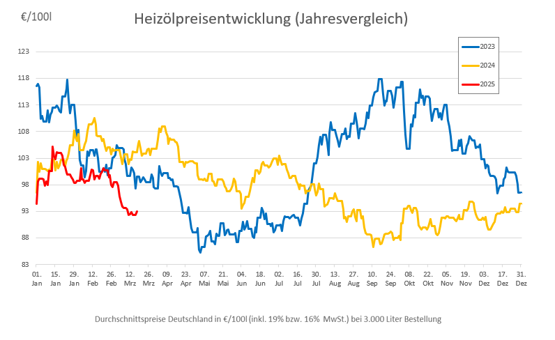 Der Preis für Heizöl bleibt im gesamten Bundesgebiet vergleichsweise günstig, auch wenn die wochenlange Preisrückgang seit Mitte Februar inzwischen beendet zu sein scheint. Im Vergleich zu Freitag muss mit leichten Aufschlägen gerechnet werden, aber im Mehrjahresvergleich zeigt sich, dass der Preis für 100 Liter aktuell sehr klar unter dem Niveau von 2023 und 2024 liegt.