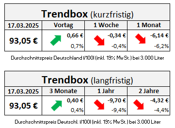Im Vergleich zu Freitag müssen Verbraucherinnen und Verbraucher sich heute Vormittag auf kleinere Aufschläge einstellen. So kosten 100 Liter heute im bundesweiten Durchschnitt etwa 66 Cent mehr als Ende letzter Woche. Längerfristig betrachtet zeigen sich aber die grundsätzlichen Preisnachlässe der vergangenen Wochen auch in der Trendbox – so kostet Heizöl im Duschschnitt heute immer noch etwa 34 Cent weniger als noch letzten Montag.