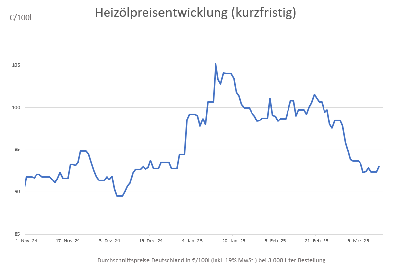 In den vergangenen Wochen hatten die Inlandspreise parallel zu den internationalen Börsenpreisen stetig nachgegeben. Seit dem bisherigen Jahreshöchststand am 13. Januar, als 100 Liter Heizöl im bundesweiten Durchschnitt 105,19 Euro kosteten, sind die Preise um 11,5 Prozent gesunken. Allein seit Anfang März haben die Preise um 5,6 Prozent nachgegeben. Seit letzter Woche haben sich die Börsen allerdings etwas stabilisiert und so ist auch der Preisrutsch im Inland erst einmal beendet.