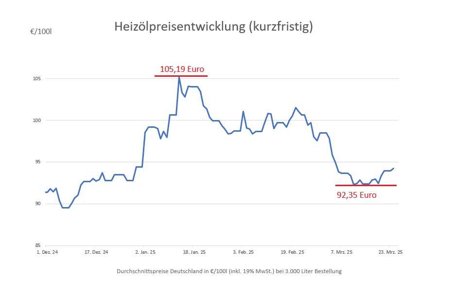 Die genannten Heizölpreise beziehen sich stets auf den deutschlandweiten Durchschnittspreis bei einer Bestellung von 3.000 Liter Heizöl Standard schwefelarm inklusive 19% MwSt. Außerdem fallen durch Transportkosten die Preise regional unterschiedlich aus. Stand der Preise 24.03.2025