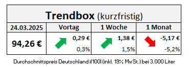 Dennoch ist die Abwärtsbewegung, die sich seit Ende Februar durchgesetzt hatte, offenbar erst einmal vorbei. Am 11. März erreichten die Preisniveaus im Bundesgebiet mit durchschnittlich 92,35 Euro pro 100 Liter ihren bisherigen Jahrestiefststand. Diesen konnten sie seitdem nicht mehr unterschreiten und stiegen dann letzte Woche erstmals wieder etwas deutlicher an. Heute muss im Vergleich zum 11. März mit einem Aufschlag von fast 2 Euro gerechnet werden.