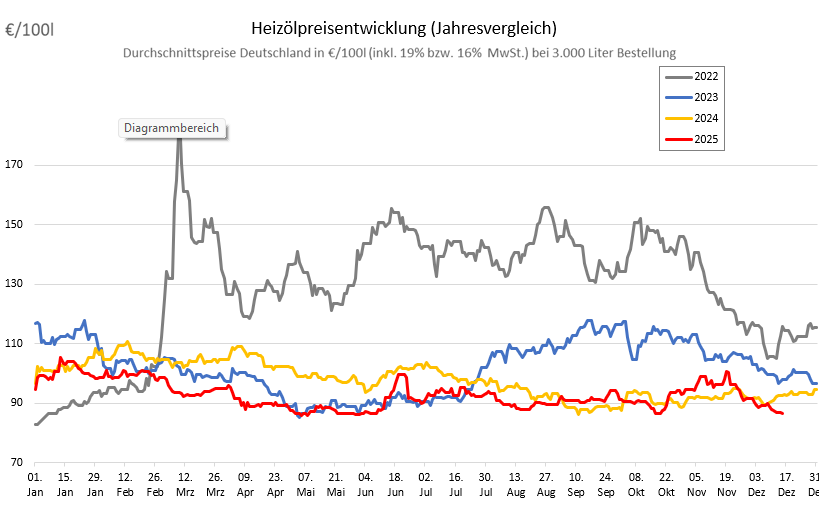 Die genannten Heizölpreise beziehen sich stets auf den deutschlandweiten Durchschnittspreis bei einer Bestellung von 3.000 Liter Heizöl Standard schwefelarm inklusive 19% MwSt. Außerdem fallen durch Transportkosten die Preise regional unterschiedlich aus. Stand der Preise 15.12.2025