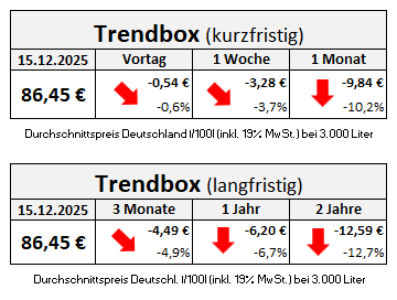 Zum Wochenbeginn sind die durchschnittlichen Heizölpreise, verglichen mit vergangenem Freitag, bereits etwas gesunken, weshalb Abnehmerinnen und Abnehmer im Bundesgebiet derzeit durchschnittlich etwa -0,54 Euro weniger zahlen als am 12.12.2025. Verglichen mit dem Start der letzten Woche ist Heizöl aktuell etwa -3,28 Euro günstiger. Die hohen Preise von vor einem Monat sind passé, mit damals verglichen zahlen Heizölkäufer heute -9,84 Euro weniger, entsprechend knapp -10,2 Prozent Abschlag zu den Preisen um den 15. November.