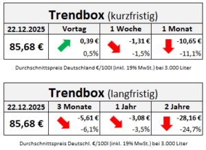 Was die langfristigen Preisentwicklungen anbelangt haben sich die Abwärtsbewegungen ebenfalls fortgesetzt. So liegen die Preise derzeit etwa -5,61 € unter dem Niveau vom 22. September 2025 und sind damit -6,1 Prozent niedriger. Bei Betrachtung der letzten Jahre zeigt sich ebenfalls weiterhin eine Abwärtstendenz der Heizölpreise. So ist das Produkt im deutschlandweiten Durchschnitt aktuell rund -3,08 Euro pro 100 Liter günstiger als zum entsprechenden Zeitpunkt des Vorjahres. Im Vergleich zum 22. September 2023 ergab sich ein Rückgang um -28,16 Euro günstiger.