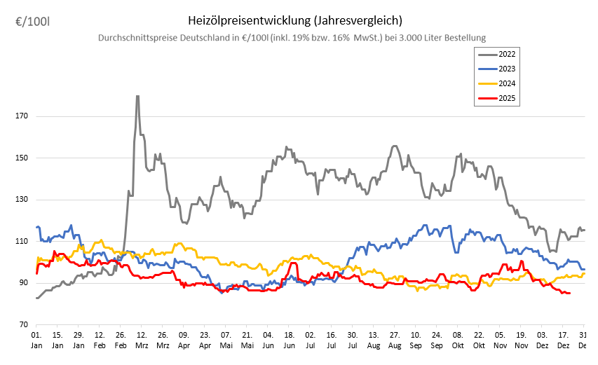 Die genannten Heizölpreise beziehen sich stets auf den deutschlandweiten Durchschnittspreis bei einer Bestellung von 3.000 Liter Heizöl Standard schwefelarm inklusive 19% MwSt. Außerdem fallen durch Transportkosten die Preise regional unterschiedlich aus. Stand der Preise 22.12.2025