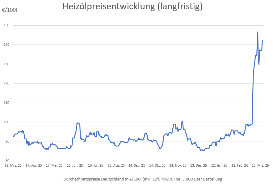 Die genannten Heizölpreise beziehen sich stets auf den deutschlandweiten Durchschnittspreis bei einer Bestellung von 3.000 Liter Heizöl Standard schwefelarm inklusive 19% MwSt. Außerdem fallen durch Transportkosten die Preise regional unterschiedlich aus. Stand der Preise 16.03.2026