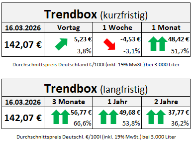 Die kurzfristigen Preisentwicklungen von Heizöl sind derzeit durch die allgemeine Volatilität am Ölmarkt geprägt. Entsprechend gibt es fast täglich ein erhebliches Auf- und Ab bei den Heizölpreisen. Dieser stieg heute, im Vergleich zum vergangenen Freitag, um +5,23 Euro bzw. +3,8 Prozent. Dementgegen zahlen Käufer von Heizöl aktuell, verglichen mit vor einer Woche -4,53 Euro weniger. Schauen wir weiter zu vor einem Monat, bevor die aktuellen Konflikte hochkochen konnten, stiegen die Heizölpreise seitdem um +48,42 Euro, entsprechend +51,7 Prozent.